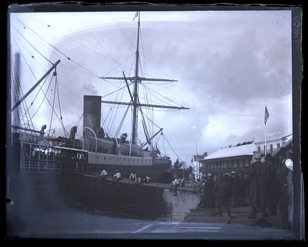 Glass negative showing a view of nine men building a gangplank between the steamship Trinidad and the dock. The men straddle the gangplank, some tying ropes around it. The ship contains a mast and a smokestack. A large group of people gather on the dock.