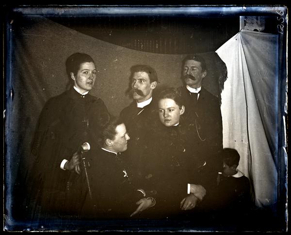 Glass negative showing John Emlen, Sarah Emlen, Jennie Jones, Walter P. Shipley, Marriott Canby Morris, and his sister Elizabeth Canby Morris posed against a draped sheet. The men and one of the women stand while the other two women sit. John Emlen as a young boy stands to the right of the group. The women wear high-necked dresses and the men wear three-piece suits. Both men have mustaches.