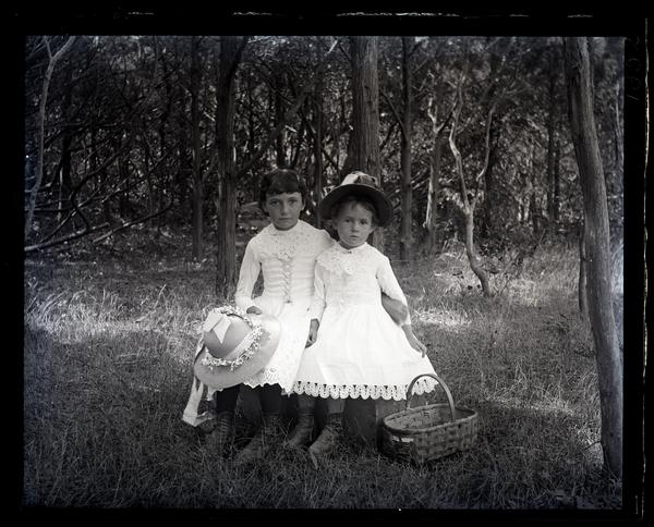 Glass negative showing Phoebe and Georgianna Read, two young girls, seated on a wooden box. The girls wear dresses with lace details and have straw hats with ribbons. An empty basket sits on the right and a forest of trees stands behind them.