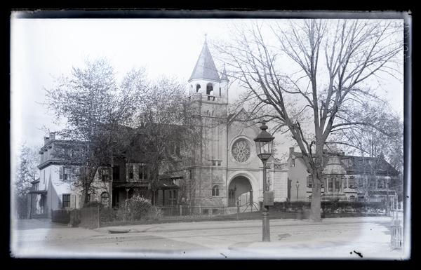 Glass negative showing the Market Square Presbyterian Church at 5507 Germantown Avenue and Maret Square. The church has a spire on the left side of the building and a rose window located over a rounded entryway. A large tree grows in the sidewalk in front of the church and a lamppost stands on the opposite side of the street. The square streches between the church and the road. The Green, Market Square was established from land originally owned by James De la Plaine as early as 1703. As a center of community activity, Market Square contained not only market stalls but also the prison and stocks. Samuel B. Morris planted many of the Square’s original trees. Prominent buildings situated around the Square include the Deshler-Morris House, the German Reformed Church, and the Fromberger-Harkness House. Originally built as a Dutch Reformed Church circa 1710, the Market Square Presbyterian Church became a German Reformed Church by 1732. The building was razed and rebuilt in 1838-1839, and then enlarged in 1857. The congregation, led by pastor Jacob Helffenstein, withdrew from the Reformed Church in 1855, become Presbyterian in 1858. In 1888, the church was rebuilt after the designs of architect George T. Pearson. By the early 21st-century, it housed the Impacting Your World Christian Center.