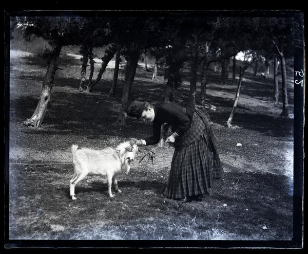 Glass negative showing Marriott C. Morris' sister Elizabeth Canby Morris bending over to pet a goat's head. The goat is tethered by a leash and stands in a field dotted with trees. Morris wears a checkered skirt and a hat.