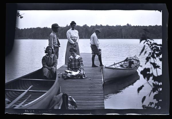 Film negative showing a group of women and children, including Marriott C. Morris' wife Jane Rhoads Morris and their children Janet Morris and Marriott Canby Morris Jr., on a dock at the lake at Pocono Lake. Janet Morris sits in a canoe on the dock and another boat floats in the water to the right. She wears a dress with ribbons in her hair. Another young woman sits on the dock wearing a plaid dress with a book open in her lap. Marriott Morris Jr. stands to her left, wearing glasses, a tie, and a hat. Jane Morris stands behind her wearing a white blous and long skirt. A second boy stands near the empty canoe looking down at the water. The Pocono Lake Preserve was pioneered by a group of Quakers, including Isaac Sharpless, who camped in the area in 1904. In 1908, this group bought the property from the Pocono Mountain Ice Company and designed it as a basic, rustic campground.