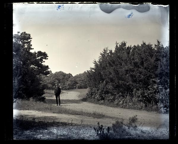 Glass negative showing Marriott C. Morris' brother Samuel Buckley Morris with his hands in his pockets standing at the fork of a dirt road lined with wheel tracks in Crescent Park. Trees and grass grow on either side of the road.
