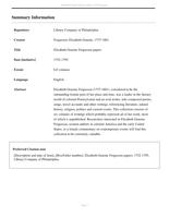 This collection consists of six volumes of writings by Elizabeth Graeme Fergusson who is considered to be the outstanding female poet of her place and time, and a leader in the literary world of colonial Pennsylvania. These volumes, which date from 1752 to 1799, are arranged alphabetically by title.