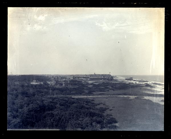 Glass negative showing a view of the Sea Girt shore seen from the top of the Morris family home, Avocado. The ocean is on the right and various buildings occupy the dunes to the left.