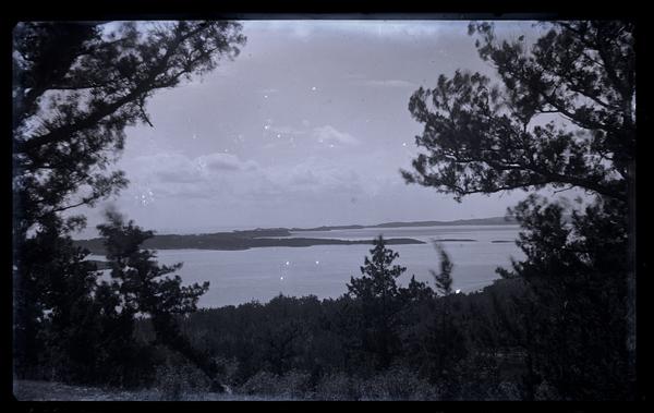 Glass negative showing a view of Castle Harbor seen from a distance from the top of a hill on St. David's Island. Tree branches frame the scene in the foreground as the tree-lined shore curves around the bay below. Castle Island lies in the distance.