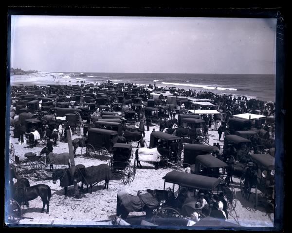 Glass negative showing a large group of horse-drawn carriages gathered on the beach for Jersey Wash Day. People weave in and out of the wagons, which are crowded together up to the shoreline. Jersey Wash Day, also known as Salt Water Day or Ocean Day, was an annual event held the second Saturday of August near Wreck Pond in Sea Girt. Farmers living twenty to thirty miles from Sea Girt came to the sea to spend a day bathing and celebrating. The tradition, begun before 1853, stopped around the 1930s.