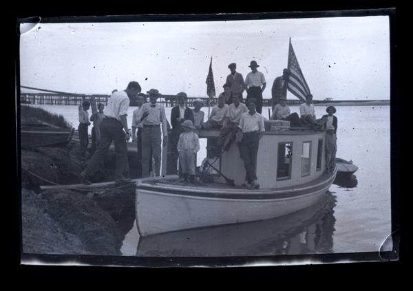 Film negative showing a group of men and boys from the Germantown Boys' Club gathered on a boat moored near the shore at Stone Harbor. An American flag flies from the top of the boat and a long causeway is visible in the background. Founded in 1887, the Boys’ Parlors Association of Germantown served as a safe space for neighborhood children whose parents worked longer hours in an industrializing city. The name changed in 1907 to the Germantown Boys’ Club after joining ranks with the Boys and Girls Clubs of America. Marriott Canby Morris served as the president of the club in the first decade of the 1900s.