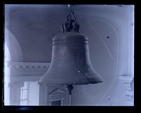 Glass negative showing the Liberty Bell suspended from a pulley inside Independence Hall. The bell is inscribed with words and Roman numerals and has a large crack down the center. Construction on Independence Hall began in 1732 and completed in 1753 after the designs of Andrew Hamilton (1676-1741) and Edmund Woolley (1695-1771). It originally housed all three branches of the Pennsylvania colonial government, as well as being host to the signing of the Declaration of Independence, and the Constitutional Convention. The building went through numerous renovations and reconstructions, until in 1950 when the National Park Service restored much of the architecture and interior to its 1776 appearance. It is a part of Independence National Park and a major tourist attraction as of the 21st century. The Liberty Bell was commissioned in 1752 by the Pennsylvania Provincial Assembly. It first cracked after its arrival in Philadelphia and was recast twice by John Pass and John Stow. The large distinctive crack formed sometime in the early 19th century. The bell moved from Independence Hall to a nearby glass pavilion in 1976, and from there to Liberty Bell Center in 2003.