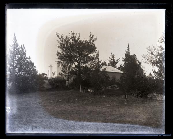 Glass negative showing Godet's (possibly Frederick Godet's) house with a tall chimney on the right side. The house is mostly obscured by trees and other foliage and is seen from a distance across a wide lawn.