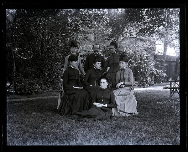 Glass negative showing Sallie Emlen, Mary Emlen, Anne Emlen, Mr. Heins, Jennie Jones, Alice Shipley, and Marriott C. Morris' sister Elizabeth Canby Morris in the Deshler-Morris House garden at 5442 Germantown Avenue. Three of the women sit while Elizabeth Morris reclines in the grass at their feet. The other two women and Mr. Heins stand behind the chairs. The women wear high-necked dresses with hats while Mr. Heins wears a suit. David Deshler built the original four-room summer cottage on this Germantown lot in 1752, adding the three-story front addition in 1772. The house was sold to Col. Isaac Franks in 1792 after Deshler’s death. President George Washington rented the home for the duration of the yellow fever epidemic of 1793 and the summer of 1794. Elliston and John Perot purchased the house in 1804, selling it to Elliston’s son-in-law Samuel B. Morris after his death in 1834. The house stayed in the possession of the Morris family for over a century, when Elliston P. Morris donated the house to the National Parks Service in 1948. The name was officially changed to the Germantown White House in 2009.