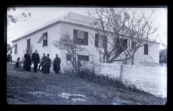 Glass negative showing the old two-story Perot house built on a hill. Mr. Syphur and Marriott C. Morris' distant cousins Morris Perot and Rebecca Perot, parents and Elliston P. Morris and Martha Canby Morris, and sister Elizabeth Canby stand next to the house at the top of the hill. A stone wall extends from the corner of the house and a tree grows in the yard behind it. Elizabeth Morris sits to the left of the group. The men wear three-piece suits and the women wear long dresses and hats. Joseph C. Dickinson bought the Port Royal Perot house from William B. Perot in 1880.