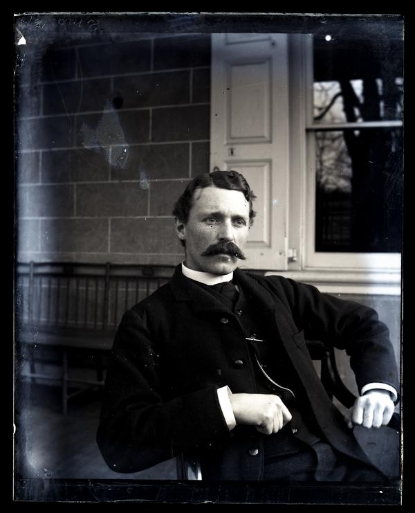 Glass negative showing Marriott C. Morris with a thick mustache seated on the porch of the Deshler-Morris House at 5442 Germantown Avenue. He wears a suit and sits facing the camera in a three quarter length pose. A long wooden bench and a shuttered window are visible behind him. David Deshler built the original four-room summer cottage on this Germantown lot in 1752, adding the three-story front addition in 1772. The house was sold to Col. Isaac Franks in 1792 after Deshler’s death. President George Washington rented the home for the duration of the yellow fever epidemic of 1793 and the summer of 1794. Elliston and John Perot purchased the house in 1804, selling it to Elliston’s son-in-law Samuel B. Morris after his death in 1834. The house stayed in the possession of the Morris family for over a century, when Elliston P. Morris donated the house to the National Parks Service in 1948. The name was officially changed to the Germantown White House in 2009.