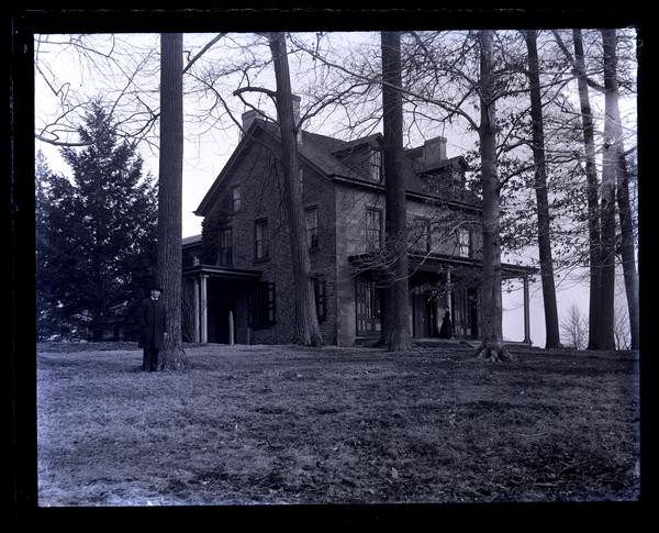 Glass negative showing Marriott Morris' Uncle Samuel Morris' two-story stone house with a porch, multiple chimneys and gabled windows. A woman leans against a pole on the porch and a man stands on the lawn under a tall tree.