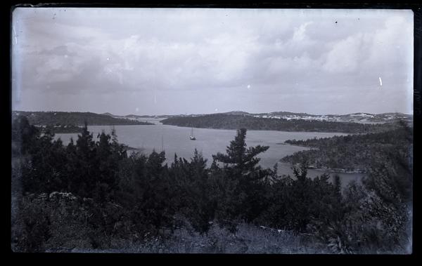 Glass negative showing a view of the harbor of St. George seen from a distance from the top of a hill. Boats sail in the bay while the tree-lined shore curves around, forming an inlet in the far shore. In the far distance, a town on St. David's Island is visible.