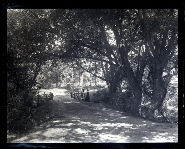 Glass negative showing a path at near the former Howell Iron Works at Allaire, N.J. leading through the woods with a bridge over a stream in the center and a wooden fence in the background. Lena Goodwin and Marriott Morris' third cousin George Vaux Jr. stand on the right side of the bridge leaning on the railing. James P. Allaire (1785-1858) founded the Allaire Iron Works Company (later Howell Iron Works) in 1815. Allaire, New Jersey became a factory town for the company that built engines for steamboats circa 1824. The row homes for workers were completed in 1833, the blast furnace was made in 1831, and the Episcopalian church was built 1832-1836. Financial difficulties and discovery of iron ore deposits in Pennsylvania closed the Company in 1850. In 1957, the land was bought by Allaire Village Inc. and turned into a historic village.