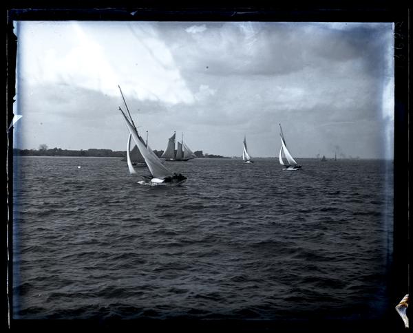 Glass negative showing sailboats racing on the choppy water of the Delaware River. The far shore is visible in the distance.