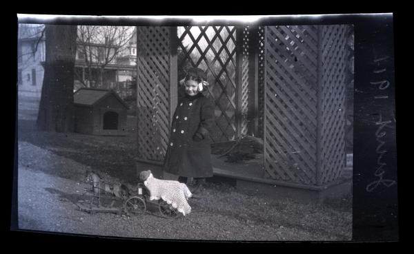 Film negative showing Marriott C. Morris' daughter Janet Morris as a girl wearing a long coat, gloves, hat, and ribbons in her hair. She stands in a garden, likely at their home at 131 W. Walnut Lane, in front of a trellised enclosure next to a toy horse and carriage carrying a teddy bear covered in a blanket.