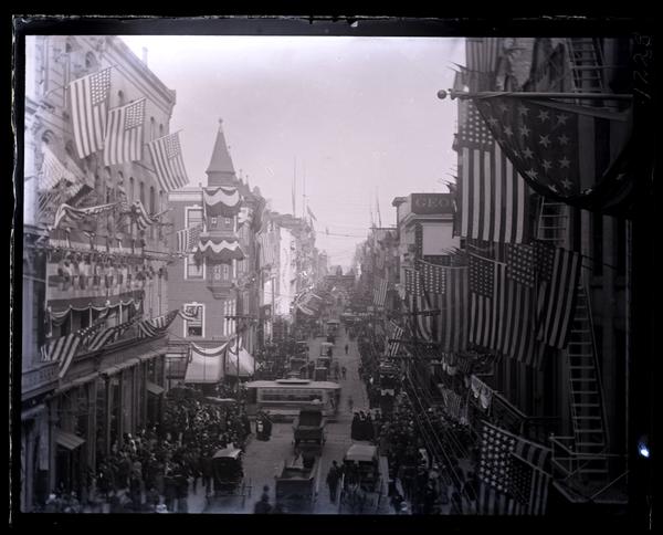 Glass negative showing a view of Chestnut Street seen from above during the Centennial celebrations. The street is filled with carriages and people. American flags fly from each story of the buildings on either side of the street. The Centennial Anniversary of the framing and creation of the Constitution was held on September 16-18, 1887 in Philadelphia. Organized by representatives from the various states and territories, the festivities included a military display, orations and concerts, and an industrial parade.