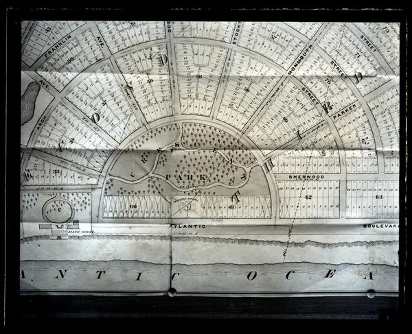 Glass negative showing a framed map of Sea Girt, including streets, bodies of water, and other landmarks. The photo shows a detail of Crescent Park and the shore.