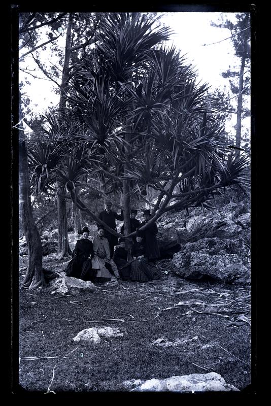 Glass negative showing a group showing Samuel Brown, Mrs. J.W. Paul, May Sharp, and Rachel Brown, and Marriott Morris' sister Elizabeth Canby Morris and parents Elliston P. Morris and Martha Canby Morris, gathered under the branches of a large palm tree. Four women sit at the base of the tree while two men and one woman stand behind them. The women wear long dresses and hats while the men wear long coats and hats. Elizabeth and Martha Morris carry parosols. Trees and other foliage grow around the palm.