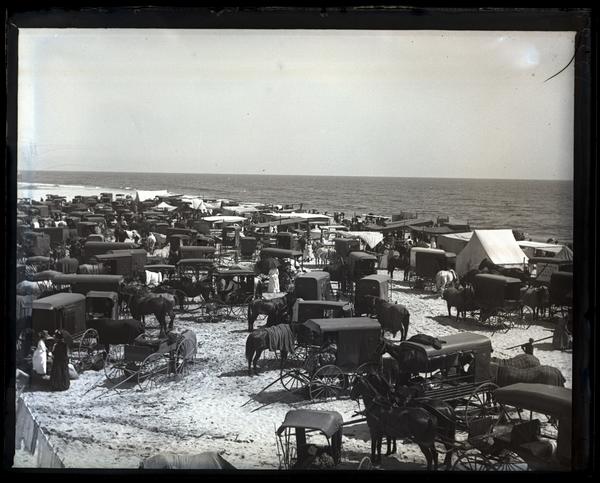 Glass negative showing a large group of horse-drawn carriages gathered on the beach for Jersey Wash Day. People walk between the carriages toward the shoreline in the distance. Jersey Wash Day, also known as Salt Water Day or Ocean Day, was an annual event held the second Saturday of August near Wreck Pond in Sea Girt. Farmers living twenty to thirty miles from Sea Girt came to the sea to spend a day bathing and celebrating. The tradition, begun before 1853, stopped around the 1930s.