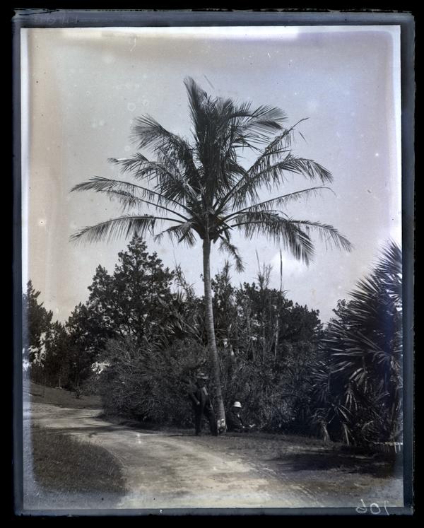Glass negative showing a large palm tree set in a garden. One man stands next to the tree while another man sits beneath it. A path runs to the left and trees and other foliage grow to the right.