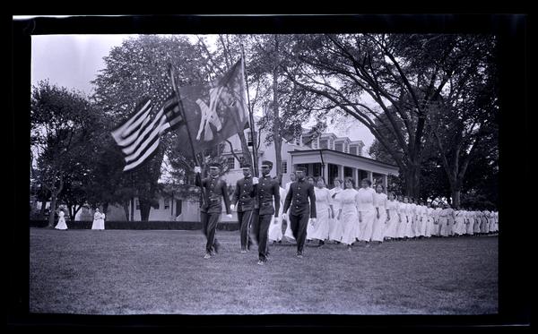 Shows a group of women students, attired in white dresses, marching in lines across a lawn at the Hampton Institute. Walking in front of the women are four African American men, attired in uniforms and caps, two of which carry an American and a "H.I." flag. They march past the Mansion House with its columned portico. In the left background, several women walk on the grass. The Hampton Institute, originally the Hampton Agricultural and Industrial School, was founded in 1868 by the American Missionary Association to provide education for freed Black citizens after the Civil War. It was built on the grounds of a former plantation, known as Little Scotland. The school was legally chartered in 1870 and accredited as a university in 1984. Notable graduates include Booker T. Washington. The Mansion House was the original residence of the plantation built in 1828.