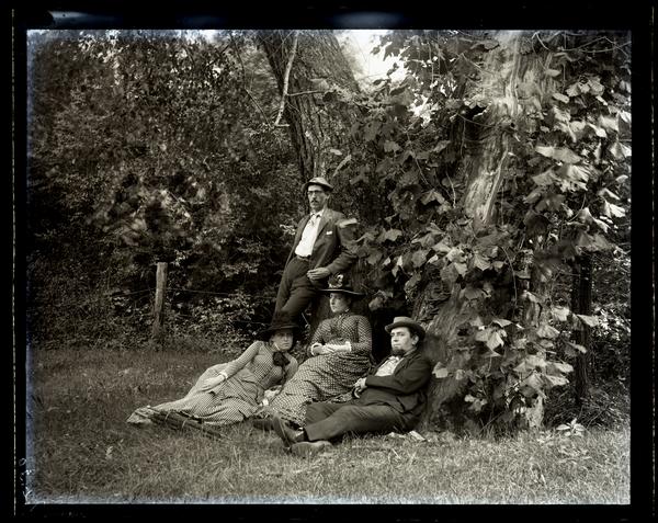 Glass negative showing Marriott Morris' father Elliston P. Morris, sister Elizabeth Canby Morris, third cousin Caspar Morris and possibly his third cousin Caroline Morris resting beneath a large, leafy tree at Allaire, N.J. Caspar Morris stands while the others sit on the grass. A wire fence with wooden posts runs behind the tree surrounded by brush. The women wear long patterned dresses and hats while the men wear three-piece suits and hats. James P. Allaire (1785-1858) founded the Allaire Iron Works Company (later Howell Iron Works) in 1815. Allaire, New Jersey became a factory town for the company that built engines for steamboats circa 1824. The row homes for workers were completed in 1833, the blast furnace was made in 1831, and the Episcopalian church was built 1832-1836. Financial difficulties and discovery of iron ore deposits in Pennsylvania closed the Company in 1850. In 1957, the land was bought by Allaire Village Inc. and turned into a historic village.