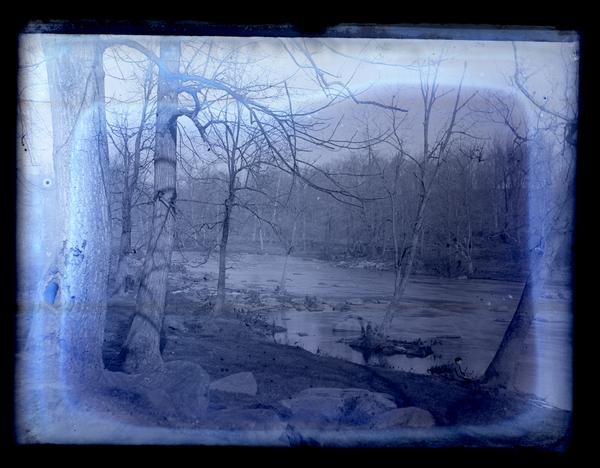 Glass negative showing Brandywine Creek running over a rocky streambed. Trees line the shore and a boy, possibly Marriott Morris' cousin William Marriott Canby Jr., sits on the left side of the river.