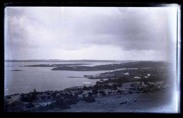 Glass negative showing a view of a harbor town on St. George's Island seen from Fort George on top of a hill. Two people sit on the grassy hillside overlooking the various buildings lining the shore. Trees grow along the shoreline as it curves to the left.