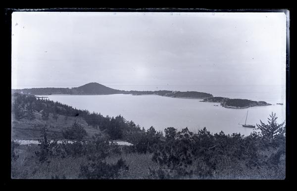 Glass negative showing a view of Ellis Harbor seen from Scaur Hill. A sailboat floats in the bay near the shore. Trees grow along the shoreline as it curves, creating an inlet on the left.