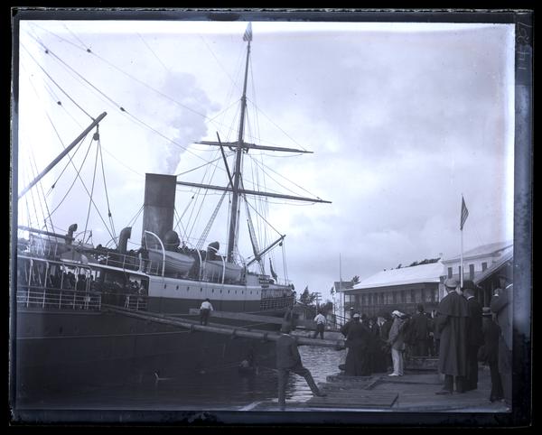 Glass negative showing a view of three men building a gangplank between the steamship Trinidad and the dock. Two of the men hold a long plank of wood over the half-constructed gangplank while the third man walks away. The ship contains a mast and a smokestack. A large group of people gather on the dock.