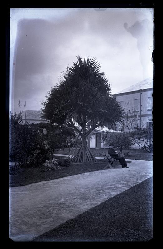 Glass negative showing a pine tree with exposed roots standing at the corner of a path in a garden at St. George's, Bermuda. Marriott Morris' father Elliston P. Morris sits on a bench next to the path and other foliage grows behind the tree. Two buildings are visible behind the tree in the background.
