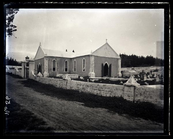 Glass negative showing St. Anne's Church with lancet windows and doorways. A cemetery surrounds the churchyard. The church and cemetery are surrounded by a low stone wall and set next to a dirt road. Originally named Port Royall Church, St. Anne’s Church was built between 1616 and 1626 in Southampton, Bermuda. After a hurricane destroyed the original wooden structure in 1716, a stone church was built in 1719. The church building underwent extensive renovations in 1925 and 2001. The graveyard contains graves dating back to 1668.
