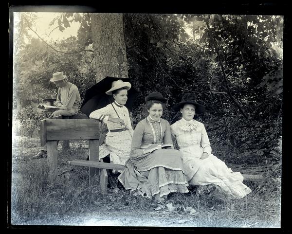 Glass negative showing a Pattie Mellor, Gertrude Mellor, and Marriott C. Morris' sister Elizabeth Canby Morris resting in the grass near the forest at Manasquan, N.J. Gerturde Mellor sits on the left holding a parasol. A man sits in the backgruond reading a book. The women wear high-necked, light-colored dresses wiht hats.