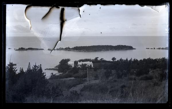 Glass negative showing a view of an island seen from a distance on top of Scaur Hill. A wooden walkway leads down the hill toward the water where a building stands next to the shore. The island and the hillside are covered in trees.
