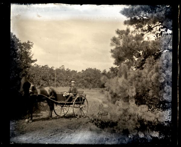 Glass negative showing Marriott C. Morris driving a horse-drawn cart down a dirt road at Sea Girt. Thick trees grow on either side of the road.