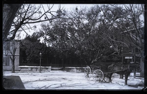 Glass negative showing a view of a low stone wall and metal fence with the facade of Par-la-Ville barely visible through the tree branches. A tree-lined street with a horse-drawn carriage waiting is visible in the foreground. A building to the right holds a sign reading: "Jas H. Masters." Par-la-Ville was built for William B. Perot, Bermuda’s first postmaster, in 1814. The grounds became a national park, renamed Queen Elizabeth Park, while the house became the home of the Bermuda National Library and Bermuda Historical Society Museum.
