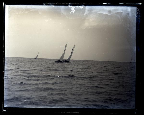 Glass negative showing two sailboats on the water at Barnegat Bay. Another boat is visible in the distance to the right. All three boats lean to the left on slightly choppy water.