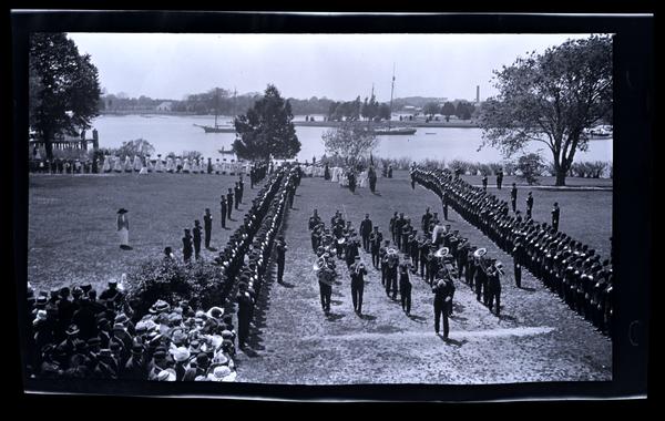 Film negative showing a marching band leading a procession of African American women through two straight rows of African American men, attired in in uniforms and caps, at Hampton Institute. In the foreground, the African American men play their musical instruments while marching in five columns. Flanking them, the men stand at attention holding their hats to their chests. Following the band are several men carrying flags and the women, attired in white dresses, walking in rows. In the left, a crowd of white and African American men and women watch the scene. In the background, is the Hampton River where several boats sail and trees grow along the banks. The Hampton Institute, originally the Hampton Agricultural and Industrial School, was founded in 1868 by the American Missionary Association to provide education for freed Black citizens after the Civil War. It was built on the grounds of a former plantation, known as Little Scotland. The school was legally chartered in 1870 and accredited as a university in 1984. Notable graduates include Booker T. Washington.