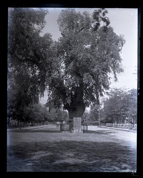 Glass negative showing the large tree known as the Washington Elm in Cambridge Park. A metal fence surrounds the wide tree trunk and a plaque stands in front of it. Paths and fences, as well as other trees surround the elm. According to popular legend, George Washington took command of the American Army under this tree. The lore has largely been discredited. The tree died in 1923.