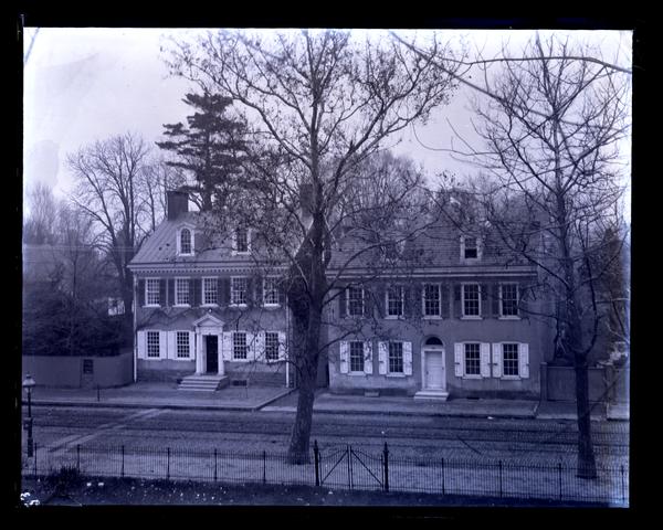 Glass negative showing the Deshler-Morris House at 5442 Germantown Avenue and Schaeffer's house, seen from across a brick road. The houses are each two-stories with shuttered windows on the first floor and steps leading up to the entryway. Two large trees stand on the opposite side of the street. David Deshler built the original four-room summer cottage on this Germantown lot in 1752, adding the three-story front addition in 1772. The house was sold to Col. Isaac Franks in 1792 after Deshler’s death. President George Washington rented the home for the duration of the yellow fever epidemic of 1793 and the summer of 1794. Elliston and John Perot purchased the house in 1804, selling it to Elliston’s son-in-law Samuel B. Morris after his death in 1834. The house stayed in the possession of the Morris family for over a century, when Elliston P. Morris donated the house to the National Parks Service in 1948. The name was officially changed to the Germantown White House in 2009. : First called The Green, Market Square was established from land originally owned by James De la Plaine as early as 1703. As a center of community activity, Market Square contained not only market stalls but also the prison and stocks. Samuel B. Morris planted many of the Square’s original trees. Prominent buildings situated around the Square include the Deshler-Morris House, the German Reformed Church, and the Fromberger-Harkness House.