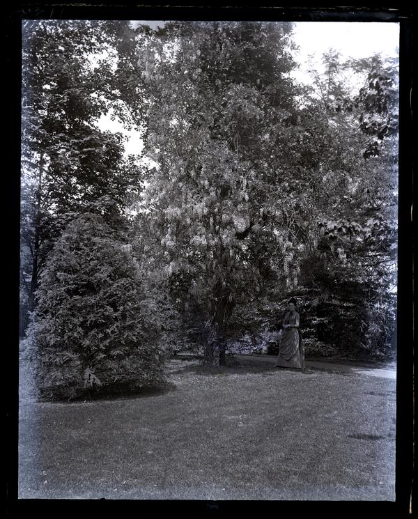 Glass negative showing a wistaria plant over a pear tree in the garden at the Deshler-Morris House at 5442 Germantown Avenue. Marriott C. Morris' sister Elizabeth Canby Morris stands on the lawn next to the right of the tree. She wears a high-necked dress and a hat. A tall shrub stands to the left of the tree. David Deshler built the original four-room summer cottage on this Germantown lot in 1752, adding the three-story front addition in 1772. The house was sold to Col. Isaac Franks in 1792 after Deshler’s death. President George Washington rented the home for the duration of the yellow fever epidemic of 1793 and the summer of 1794. Elliston and John Perot purchased the house in 1804, selling it to Elliston’s son-in-law Samuel B. Morris after his death in 1834. The house stayed in the possession of the Morris family for over a century, when Elliston P. Morris donated the house to the National Parks Service in 1948. The name was officially changed to the Germantown White House in 2009.