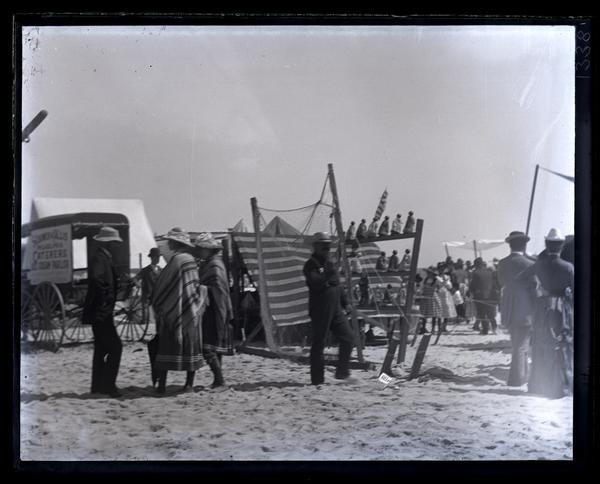 Glass negative showing a series of carts and stalls set up on the beach for Jersey Wash Day. One of the stalls holds miniature dolls. People converse in groups and walk among the vendors. Jersey Wash Day, also known as Salt Water Day or Ocean Day, was an annual event held the second Saturday of August near Wreck Pond in Sea Girt. Farmers living twenty to thirty miles from Sea Girt came to the sea to spend a day bathing and celebrating. The tradition, begun before 1853, stopped around the 1930s.