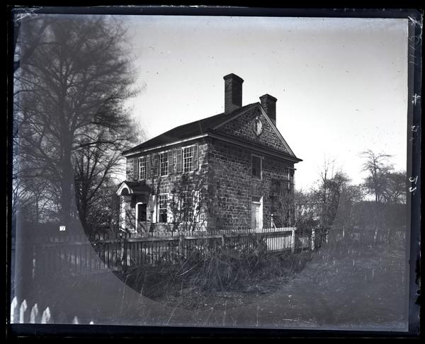 Glass negative showing the Isaac Potts House, a stone two-story house with shuttered windows and two chimneys at Valley Forge. A wooden fence runs along the left side of the building. From December 1777 to June 1778, the Continental Army camped at Valley Forge. The area became Pennsylvania’s first state park in 1893. George Washington’s headquarters was in the Isaac Potts House, built circa 1773.
