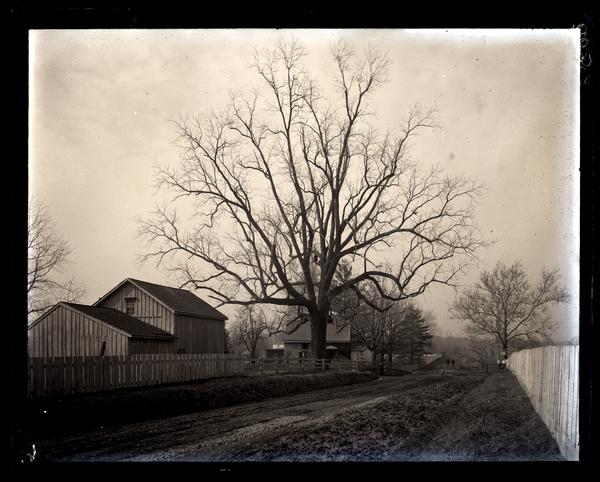 Glass negative showing a large, bare walnut tree standing next to Marriott Morris' Uncle Samuel's barn. A dirt road runs to the right of the tree, which is behind a wooden fence. Two figues are visible at the end of the road. A second building stands behind the tree.
