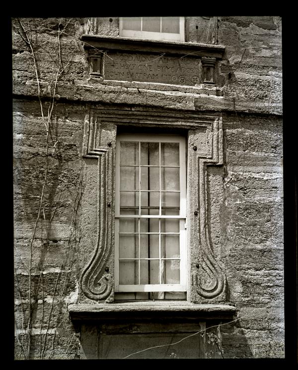 Glass negative showing a window on John Bartram's house with a carved scrolling motif surrounding the pane. There is a carved stone plaque above the window and a narrow sill beneath it. The plaque is inscribed: "Tis God Alone Almiyty Lord, the Holy One by me Adord. John Bartram 1770." Bartram’s Gardens, founded by American botanist John Bartram, is the oldest surviving botanic garden in North America. Built in 1728, the gardens cover forty-six acres with a focus in North American plants. The Gardens became a Philadelphia city park in 1891. Bartram’s stone house was originally built 1728-1731.