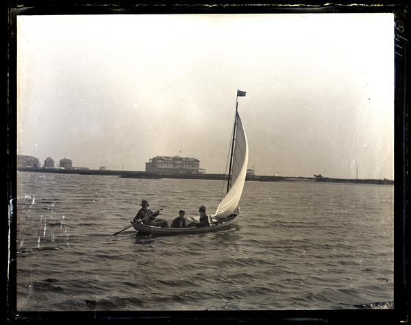 Glass negative showing a sailboat carrying a group of people on Wreck Pond. The man in the back of the sailboat holds an oar in the water. The tree-lined shore is visible in the distance across the water.