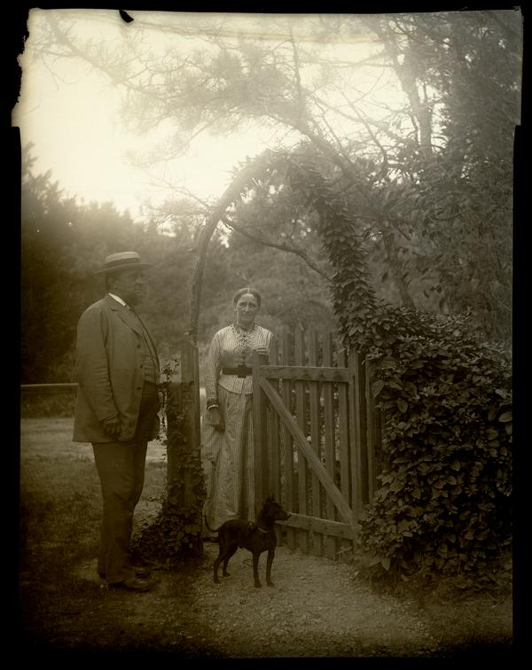 Film negative showing a view of Marriott C. Morris' parents Elliston P. Morris and Martha Canby Morris standing next to a wooden gate. A leafy hedge extends to the right and an arbor forms an arch over the gate. Jet, a small black dog stands near Martha Morris' feet. She wears a long patterend dress while Elliston Morris wears a three-piece suit and hat.